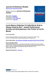 Brauner, D. ORCID: https://orcid.org/0000-0003-2817-7847 (2012) Lorrie Moore collection, 'A Little Ethnic Kink Is Always Good to See”: Jewish performance anxiety and anti-passing in the fiction of Lorrie Moore. Journal of American Studies, 46 (3). pp. 581-602. ISSN 1469-5154 doi: 10.1017/S0021875811001940