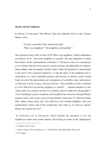 In this essay I argue that Heaney uses the figure of the neighbour to examine questions of otherness and cultural difference and their relationship to history and politics. The neighbour is of course a figure that has played a central role in Western philosophy and theology for centuries, from the Gospels and Kant to Freud and Lacan. It is also a concept to which Western poetry often returns, particularly in the work of Herbert, Clare, Eliot and Auden. Heaney too belongs to this tradition, in that his oeuvre contains many poems which consider the relationship between neighbours, and do so in ways profoundly suggestive for consideration of the relationship between historical events, social structures, cultural difference and psychic affect. In my essay I argue that Heaney sketches a profoundly materialist conception of subjectivity in its relationship with the Other. In doing so I contrast Heaney’s treatment of the neighbour, with its emphasis on questions of politics and locality, to the treatment of the neighbour in the ethical philosophy of Emmanuel Levinas.