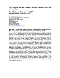 Edwards, V. M. (2004) Community based ecotourism as a panacea for protected areas: the use of common property theory in its analysis and development. In: The Commons in an Age of Global Transition: challenges, risks and opportunities, 9-13 August 2004, Mexico.