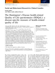 The Huntington's disease health-related quality of life questionnaire: a disease-specific measure of health-related quality of life. Huntington's disease (HD) is a genetic neurodegenerative disorder characterized by motor, cognitive and psychiatric disturbances, and yet there is no disease-specific patient-reported health-related quality of life outcome measure for patients. Our aim was to develop and validate such an instrument, i.e. the Huntington's Disease health-related Quality of Life questionnaire (HDQoL), to capture the true impact of living with this disease. Semi-structured interviews were conducted with the full spectrum of people living with HD, to form a pool of items, which were then examined in a larger sample prior to data-driven item reduction. We provide the statistical basis for the extraction of three different sets of scales from the HDQoL, and present validation and psychometric data on these scales using a sample of 152 participants living with HD. These new patient-derived scales provide promising patient-reported outcome measures for HD.