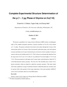Zheleva, Z. V., Eralp, T. and Held, G. (2011) Complete Experimental Structure Determination of the p(3x2)pg Phase of Glycine on Cu{110}. Journal of Physical Chemistry A, 116 (1). pp. 618-625. ISSN 1089-5639 doi: 10.1021/jp2057282