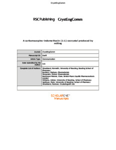 A carbamazepine-indomethacin (1:1) cocrystal produced by milling.