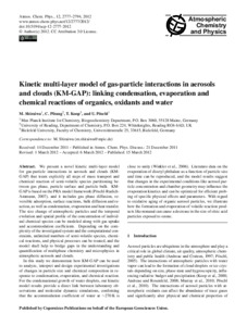 Shiraiwa, M., Pfrang, C., Koop, T. and Poschl, U. (2012) Kinetic multi-layer model of gas-particle interactions in aerosols and clouds (KM-GAP): linking condensation, evaporation and chemical reactions of organics, oxidants and water. Atmospheric Chemistry and Physics, 12 (5). pp. 2777-2794. ISSN 1680-7324 doi: 10.5194/acp-12-2777-2012