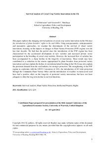 This paper explores the changing survival patterns of cereal crop variety innovations in the UK since the introduction of plant breeders’ rights in the mid-1960s. Using non-parametric, semi-parametric and parametric approaches, we examine the determinants of the survival of wheat variety innovations, focusing on the impacts of changes to Plant Variety Protection (PVP) regime over the last four decades. We find that the period since the introduction of the PVP regime has been characterised by the accelerated development of new varieties and increased private sector participation in the breeding of cereal crop varieties. However, the increased flow of varieties has been accompanied by a sharp decline in the longevity of innovations. These trends may have contributed to a reduction in the returns appropriated by plant breeders from protected variety innovations and may explain the decline of conventional plant breeding in the UK. It may also explain the persistent demand from the seed industry for stronger protection. The strengthening of the PVP regime in conformity with the UPOV Convention of 1991, the introduction of EU-wide protection through the Community Plant Variety Office and the introduction of royalties on farm-saved seed have had a positive effect on the longevity of protected variety innovations, but have not been adequate to offset the long term decline in survival durations.