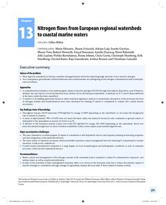 Nitrogen flows from European watersheds to coastal marine waters Executive summary Nature of the problem • Most regional watersheds in Europe constitute managed human territories importing large amounts of new reactive nitrogen. • As a consequence, groundwater, surface freshwater and coastal seawater are undergoing severe nitrogen contamination and/or eutrophication problems. Approaches • A comprehensive evaluation of net anthropogenic inputs of reactive nitrogen (NANI) through atmospheric deposition, crop N fixation,fertiliser use and import of food and feed has been carried out for all European watersheds. A database on N, P and Si fluxes delivered at the basin outlets has been assembled. • A number of modelling approaches based on either statistical regression analysis or mechanistic description of the processes involved in nitrogen transfer and transformations have been developed for relating N inputs to watersheds to outputs into coastal marine ecosystems. Key findings/state of knowledge • Throughout Europe, NANI represents 3700 kgN/km2/yr (range, 0–8400 depending on the watershed), i.e. five times the background rate of natural N2 fixation. • A mean of approximately 78% of NANI does not reach the basin outlet, but instead is stored (in soils, sediments or ground water) or eliminated to the atmosphere as reactive N forms or as N2. • N delivery to the European marine coastal zone totals 810 kgN/km2/yr (range, 200–4000 depending on the watershed), about four times the natural background. In areas of limited availability of silica, these inputs cause harmful algal blooms. Major uncertainties/challenges • The exact dimension of anthropogenic N inputs to watersheds is still imperfectly known and requires pursuing monitoring programmes and data integration at the international level. • The exact nature of ‘retention’ processes, which potentially represent a major management lever for reducing N contamination of water resources, is still poorly understood. • Coastal marine eutrophication depends to a large degree on local morphological and hydrographic conditions as well as on estuarine processes, which are also imperfectly known. Recommendations • Better control and management of the nitrogen cascade at the watershed scale is required to reduce N contamination of ground- and surface water, as well as coastal eutrophication. • In spite of the potential of these management measures, there is no choice at the European scale but to reduce the primary inputs of reactive nitrogen to watersheds, through changes in agriculture, human diet and other N flows related to human activity.