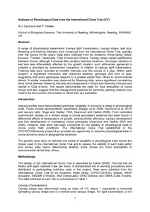 A range of physiological parameters (canopy light transmission, canopy shape, leaf size, flowering and flushing intensity) were measured from the International Clone Trial, typically over the course of two years. Data were collected from six locations, these being: Brazil, Ecuador, Trinidad, Venezuela, Côte d’Ivoire and Ghana. Canopy shape varied significantly between clones, although it showed little variation between locations. Genotypic variation in leaf size was differentially affected by the growth location; such differences appeared to underlie a genotype by environment interaction in relation to canopy light transmission. Flushing data were recorded at monthly intervals over the course of a year. Within each location, a significant interaction was observed between genotype and time of year, suggesting that some genotypes respond to a greater extent than others to environmental stimuli. A similar interaction was observed for flowering data, where significant correlations were found between flowering intensity and temperature in Brazil and flowering intensity and rainfall in Côte d’Ivoire. The results demonstrate the need for local evaluation of cocoa clones and also suggest that the management practices for particular planting material may need to be fine-tuned to the location in which they are cultivated.
