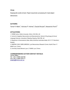 Makin, T. R., Holmes, N., Brozzoli, C. and Farnè, A. (2012) Keeping the world at hand: rapid visuomotor processing for hand-object interactions. Experimental Brain Research, 219 (4). 421--428. ISSN 0014-4819 doi: 10.1007/s00221-012-3089-5