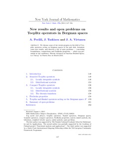 Perälä, A., Taskinen, J. and Virtanen, J. A. (2011) New results and open problems on Toeplitz operators in Bergman spaces. New York Journal of Mathematics, 17a. pp. 147-164. ISSN 1076-9803