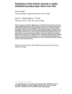 Argaín, J. L., Miranda, P. M. A. and Teixeira, M. A. C. ORCID: https://orcid.org/0000-0003-1205-3233 (2009) Estimation of the friction velocity in stably stratified boundary-layer flows over hills. Boundary-Layer Meteorology, 130 (1). pp. 15-28. ISSN 1573-1472 doi: 10.1007/s10546-008-9329-3
