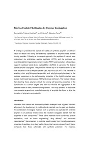 A strategy is presented that exploits the ability of synthetic polymers of different nature to disturb the strong selfassembly capabilities of amyloid based β-sheet forming peptides. Following a convergent approach, the peptides of interest were synthesized via solid-phase peptide synthesis (SPPS) and the polymers via reversible addition−fragmentation chain transfer (RAFT) polymerization, followed by a copper(I) catalyzed azide− alkyne cycloaddition (CuAAC) to generate the desired peptide− polymer conjugates. This study focuses on a modified version of the core sequence of the β-amyloid peptide (Aβ), Aβ(16−20) (KLVFF). The influence of attaching short poly(Nisopropylacrylamide) and poly(hydroxyethylacrylate) to the peptide sequences on the self-assembly properties of the hybrid materials were studied via infrared spectroscopy, TEM, circular dichroism and SAXS. The findings indicate that attaching these polymers disturbs the strong self-assembly properties of the biomolecules to a certain degree and permits to influence the aggregation of the peptides based on their β-sheets forming abilities. This study presents an innovative route toward targeted and controlled assembly of amyloid-like fibers to drive the formation of polymeric nanomaterials.