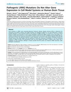 Devine, M. J., Kaganovich, A., Ryten, M., Mamais, A., Trabzuni, D., Manzoni, C., McGoldrick, P., Chan, D., Dillman, A., Zerle, J., Horan, S., Taanman, J.-W., Hardy, J., Marti-Masso, J.-F., Healy, D., Schapira, A. H., Wolozin, B., Bandopadhyay, R., Cookson, M. R., van der Brug, M. P. and Lewis, P. A. (2011) Pathogenic LRRK2 mutations do not alter gene expression in cell model systems or human brain tissue. PLoS ONE, 6 (7). e22489. ISSN 1932-6203 doi: 10.1371/journal.pone.0022489