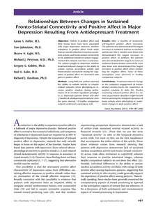 Objective: Deficits in positive affect and their neural bases have been associated with major depression. However, whether reductions in positive affect result solely from an overall reduction in nucleus accumbens activity and fronto-striatal connectivity or the additional inability to sustain engagement of this network over time is unknown. The authors sought to determine whether treatment-induced changes in the ability to sustain nucleus accumbens activity and fronto-striatal connectivity during the regulation of positive affect are associated with gains in positive affect. Method: Using fMRI, the authors assessed the ability to sustain activity in reward-related networks when attempting to increase positive emotion during per- formance of an emotion regulation para- digm in 21 depressed patients before and after 2 months of antidepressant treat- ment. Over the same interval, 14 healthy comparison subjects underwent scanning as well. Results: After 2 months of treatment, self-reported positive affect increased. The patients who demonstrated the largest increases in sustained nucleus accumbens activity over the 2 months were those who demonstrated the largest increases in positive affect. In addition, the patients who demonstrated the largest increases in sustained fronto-striatal connectivity were also those who demonstrated the largest increases in positive affect when control- ling for negative affect. None of these associations were observed in healthy comparison subjects. Conclusions: Treatment-induced change in the sustained engagement of fronto- striatal circuitry tracks the experience of positive emotion in daily life. Studies examining reduced positive affect in a va- riety of psychiatric disorders might benefit from examining the temporal dynamics of brain activity when attempting to under- stand changes in daily positive affect.