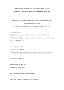 Robson, H., Davies, S., Lambon Ralph, M. and Sage, K. (2012) Facilitating and disrupting speech perception in word deafness. Aphasiology, 26 (2). pp. 177-198. ISSN 1464-5041 doi: 10.1080/02687038.2011.629360
