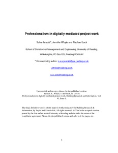 Jaradat, S., Whyte, J. and Luck, R. (2013) Professionalism in digitally-mediated project work. Building Research & Information, 41 (1). pp. 51-59. ISSN 1466-4321 doi: 10.1080/09613218.2013.743398