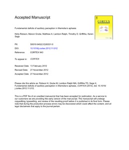 Robson, H., Grube, M., Lambon Ralph, M., Griffiths, T. and Sage, K. (2012) Fundamental deficits of auditory perception in Wernicke’s aphasia. Cortex, 49 (7). pp. 1808-1822. ISSN 0010-9452 doi: 10.1016/j.cortex.2012.11.012