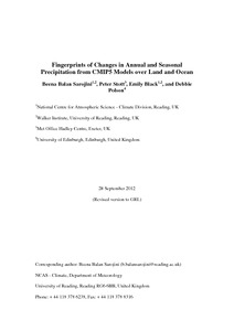 Balan Sarojini, B., Stott, P. A., Black, E. ORCID: https://orcid.org/0000-0003-1344-6186 and Polson, D. (2012) Fingerprints of changes in annual and seasonal precipitation from CMIP5 models over land and ocean. Geophysical Research Letters, 39. L21706. ISSN 1944–8007 doi: 10.1029/2012GL053373