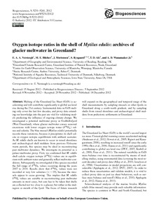 Melting of the Greenland Ice Sheet (GrIS) is accelerating and will contribute significantly to global sea level rise during the 21st century. Instrumental data on GrIS melting only cover the last few decades, and proxy data extending our knowledge into the past are vital for validating models predicting the influence of ongoing climate change. We investigated a potential meltwater proxy in Godthåbsfjord (West Greenland), where glacier meltwater causes seasonal excursions with lower oxygen isotope water (δ18Ow) values and salinity. The blue mussel (Mytilus edulis) potentially records these variations, because it precipitates its shell calcite in oxygen isotopic equilibrium with ambient seawater. As M. edulis shells are known to occur in raised shorelines and archaeological shell middens from previous Holocene warm periods, this species may be ideal in reconstructing past meltwater dynamics. We investigate its potential as a palaeo-meltwater proxy. First, we confirmed that M. edulis shell calcite oxygen isotope (δ18Oc) values are in equilibrium with ambient water and generally reflect meltwater conditions. Subsequently we investigated if this species recorded the full range of δ18Ow values occurring during the years 2007 to 2010. Results show that δ18Ow values were not recorded at very low salinities (< ~ 19), because the mussels appear to cease growing. This implies that Mytilus edulis δ18Oc values are suitable in reconstructing past meltwater amounts in most cases, but care has to be taken that shells are collected not too close to a glacier, but rather in the mid-region or mouth of the fjord. The focus of future research will expand on the geographical and temporal range of the shell measurements by sampling mussels in other fjords in Greenland along a south–north gradient, and by sampling shells from raised shorelines and archaeological shell middens from prehistoric settlements in Greenland.