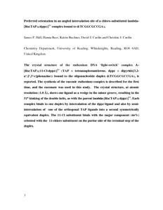 Hall, J., Beer, H., Buchner, K., Cardin, D. and Cardin, C. ORCID: https://orcid.org/0000-0002-2556-9995 (2013) Preferred orientation in an angled intercalation site of a chloro-substituted lambda- [Ru(TAP)2(dppz)]2+ complex bound to d(TCGGCGCCGA)2. Philosophical Transactions of the Royal Society. Part A, 371 (1995). 20120525. ISSN 1364-503X doi: 10.1098/rsta.2012.0525