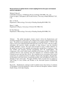 The global atmospheric electric circuit is driven by thunderstorms and electrified rain/shower clouds and is also influenced by energetic charged particles from space. The global circuit maintains the ionosphere as an equipotential at∼+250 kV with respect to the good conducting Earth (both land and oceans). Its “load” is the fair weather atmosphere and semi-fair weather atmosphere at large distances from the disturbed weather “generator” regions. The main solar-terrestrial (or space weather) influence on the global circuit arises from spatially and temporally varying fluxes of galactic cosmic rays (GCRs) and energetic electrons precipitating from the magnetosphere. All components of the circuit exhibit much variability in both space and time. Global circuit variations between solar maximum and solar minimum are considered together with Forbush decrease and solar flare effects. The variability in ion concentration and vertical current flow are considered in terms of radiative effects in the troposphere, through infra-red absorption, and cloud effects, in particular possible cloud microphysical effects from charging at layer cloud edges. The paper identifies future research areas in relation to Task Group 4 of the Climate and Weather of the Sun-Earth System (CAWSES-II) programme.