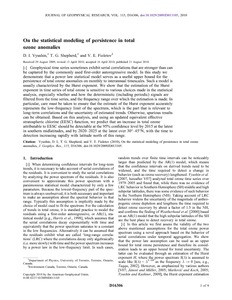 Geophysical time series sometimes exhibit serial correlations that are stronger than can be captured by the commonly used first‐order autoregressive model. In this study we demonstrate that a power law statistical model serves as a useful upper bound for the persistence of total ozone anomalies on monthly to interannual timescales. Such a model is usually characterized by the Hurst exponent. We show that the estimation of the Hurst exponent in time series of total ozone is sensitive to various choices made in the statistical analysis, especially whether and how the deterministic (including periodic) signals are filtered from the time series, and the frequency range over which the estimation is made. In particular, care must be taken to ensure that the estimate of the Hurst exponent accurately represents the low‐frequency limit of the spectrum, which is the part that is relevant to long‐term correlations and the uncertainty of estimated trends. Otherwise, spurious results can be obtained. Based on this analysis, and using an updated equivalent effective stratospheric chlorine (EESC) function, we predict that an increase in total ozone attributable to EESC should be detectable at the 95% confidence level by 2015 at the latest in southern midlatitudes, and by 2020–2025 at the latest over 30°–45°N, with the time to detection increasing rapidly with latitude north of this range.