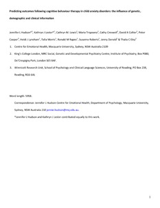 Hudson, J., Lester, K. J., Lewis, C. M., Tropeano, M., Creswell, C., Collier, D. A., Cooper, P., Lyneham, H. J., Morris, T., Rapee, R. M., Roberts, S., Donald, J. A. and Eley, T. C. (2013) Predicting outcomes following cognitive behavior therapy in child anxiety disorders: the influence of genetic, demographic and clinical information. Journal of Child Psychology and Psychiatry, 54 (10). pp. 1086-1094. ISSN 0021-9630 doi: 10.1111/jcpp.12092