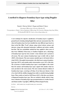 A new technique for objective classification of boundary layers is applied to ground-based vertically pointing Doppler lidar and sonic anemometer data. The observed boundary layer has been classified into nine different types based on those in the Met Office ‘Lock’ scheme, using vertical velocity variance and skewness, along with attenuated backscatter coefficient and surface sensible heat flux. This new probabilistic method has been applied to three years of data from Chilbolton Observatory in southern England and a climatology of boundary-layer type has been created. A clear diurnal cycle is present in all seasons. The most common boundary-layer type is stable with no cloud (30.0% of the dataset). The most common unstable type is well mixed with no cloud (15.4%). Decoupled stratocumulus is the third most common boundary-layer type (10.3%) and cumulus under stratocumulus occurs 1.0% of the time. The occurrence of stable boundary-layer types is much higher in the winter than the summer and boundary-layer types capped with cumulus cloud are more prevalent in the warm seasons. The most common diurnal evolution of boundary-layer types, occurring on 52 days of our three-year dataset, is that of no cloud with the stability changing from stable to unstable during daylight hours. These results are based on 16393 hours, 62.4% of the three-year dataset, of diagnosed boundary-layer type. This new method is ideally suited to long-term evaluation of boundary-layer type parametrisations in weather forecast and climate models.