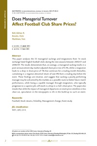 This paper analyses the 53 managerial sackings and resignations from 16 stock exchange listed English football clubs during the nine seasons between 2000/01 and 2008/09. The results demonstrate that, on average, a managerial sacking results in a post-announcement day market-adjusted share price rise of 0.3%, whilst a resignation leads to a drop in share price of 1% that continues for a trading month thereafter, cumulating in a negative abnormal return of over 8% from a trading day before the event. These findings are intuitive, and suggest that sacking a poorly performing manager may be welcomed by the markets as a possible route to better future match performance, while losing a capable manager through resignation, who typically progresses to a superior job, will result in a drop in a club’s share price. The paper also reveals that while the impact of managerial departures on stock price volatilities is less clear-cut, speculation in the newspapers is rife in the build-up to such an event.