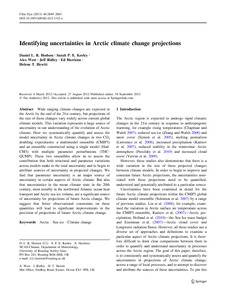Wide ranging climate changes are expected in the Arctic by the end of the 21st century, but projections of the size of these changes vary widely across current global climate models. This variation represents a large source of uncertainty in our understanding of the evolution of Arctic climate. Here we systematically quantify and assess the model uncertainty in Arctic climate changes in two CO2 doubling experiments: a multimodel ensemble (CMIP3) and an ensemble constructed using a single model (HadCM3) with multiple parameter perturbations (THC-QUMP). These two ensembles allow us to assess the contribution that both structural and parameter variations across models make to the total uncertainty and to begin to attribute sources of uncertainty in projected changes. We find that parameter uncertainty is an major source of uncertainty in certain aspects of Arctic climate. But also that uncertainties in the mean climate state in the 20th century, most notably in the northward Atlantic ocean heat transport and Arctic sea ice volume, are a significant source of uncertainty for projections of future Arctic change. We suggest that better observational constraints on these quantities will lead to significant improvements in the precision of projections of future Arctic climate change.