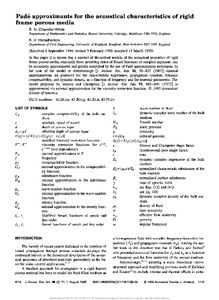 In this paper it is shown that a number of theoretical models of the acoustical properties of rigid frame porous media, especially those involving ratios of Bessel functions of complex argument, can be accurately approximated and greatly simplified by the use of Padé approximation techniques. In the case of the model of Attenborough [J. Acoust. Soc. Am. 81, 93–102 (1987)] rational approximations are produced for the characteristic impedance, propagation constant, dynamic compressibility, and dynamic density, as a function of frequency and the material parameters. The model proposed by Stinson and Champoux