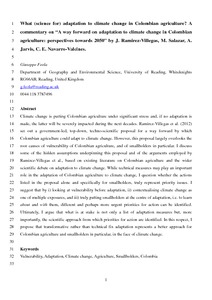 Climate change is putting Colombian agriculture under significant stress and, if no adaptation is made, the latter will be severely impacted during the next decades. Ramirez-Villegas et al. (2012) set out a government-led, top-down, techno-scientific proposal for a way forward by which Colombian agriculture could adapt to climate change. However, this proposal largely overlooks the root causes of vulnerability of Colombian agriculture, and of smallholders in particular. I discuss some of the hidden assumptions underpinning this proposal and of the arguments employed by Ramirez-Villegas et al., based on existing literature on Colombian agriculture and the wider scientific debate on adaptation to climate change. While technical measures may play an important role in the adaptation of Colombian agriculture to climate change, I question whether the actions listed in the proposal alone and specifically for smallholders, truly represent priority issues. I suggest that by i) looking at vulnerability before adaptation, ii) contextualising climate change as one of multiple exposures, and iii) truly putting smallholders at the centre of adaptation, i.e. to learn about and with them, different and perhaps more urgent priorities for action can be identified. Ultimately, I argue that what is at stake is not only a list of adaptation measures but, more importantly, the scientific approach from which priorities for action are identified. In this respect, I propose that transformative rather than technical fix adaptation represents a better approach for Colombian agriculture and smallholders in particular, in the face of climate change.