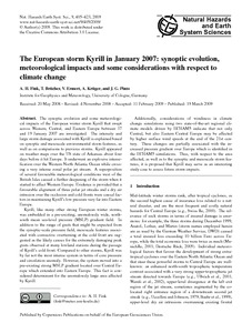 Fink, A. H., Brücher, T., Ermert, V., Krüger, A. and Pinto, J. G. (2009) The European storm Kyrill in January 2007: synoptic evolution, meteorological impacts and some considerations with respect to climate change. Natural Hazards and Earth System Science, 9 (2). pp. 405-423. ISSN 1684-9981 doi: 10.5194/nhess-9-405-2009