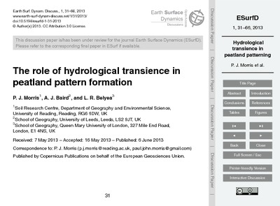 Morris, P. J., Baird, A. J. and Belyea, L. R. (2013) The role of hydrological transience in peatland pattern formation. Earth Surface Dynamics, 1 (1). pp. 31-66. ISSN 2196-6338 doi: 10.5194/esurfd-1-31-2013