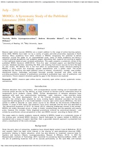 Liyanagunawardena, T. R., Adams, A. A. and Williams, S. A. (2013) MOOCs: a systematic study of the published literature 2008-2012. International Review of Research in Open and Distance Learning, 14 (3). pp. 202-227. ISSN 1492-3831