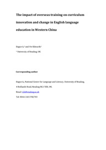 Li, D. and Edwards, V. (2013) The impact of overseas training on curriculum innovation and change in English language education in Western China. Language Teaching Research, 17 (4). pp. 390-408. ISSN 1477-0954 doi: 10.1177/1362168813494124