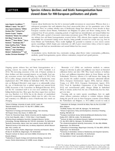 Carvalheiro, L.G., Kunin, W.E., Keil, P., Aguirre-Gutiérrez, J., Ellis, W.N., Fox, R., Groom, Q., Hennekens, S., Landuy, W.V., Maes, D., Van de Meutter, F., Michez, D., Rasmont, P., Ode, B., Potts, S. ORCID: https://orcid.org/0000-0002-2045-980X, Reemer, M., Roberts, S.P.M., Schaminée, J., WallisDeVries, M.F. and Biesmeijer, J.C. (2013) Species richness declines and biotic homogenization have slowed down for NW-European pollinators and plants. Ecology Letters, 16 (7). pp. 870-878. ISSN 1461-0248 doi: 10.1111/ele.12121