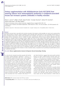 Lewis, M. C., Patel, D. V., Fowler, J., Duncker, S., Zuercher, A. W., Mercenier, A. and Bailey, M. (2013) Dietary supplementation with Bifidobacterium lactis NCC2818 from weaning reduces local immunoglobulin production in lymphoid-associated tissues but increases systemic antibodies in healthy neonates. British Journal of Nutrition, 110 (7). pp. 1243-1252. ISSN 1475-2662 doi: 10.1017/S0007114513000251