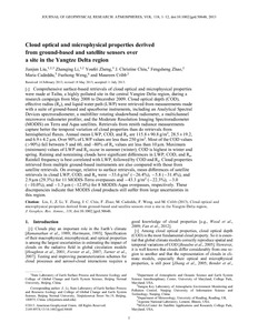 Comprehensive surface-based retrievals of cloud optical and microphysical properties were made at Taihu, a highly polluted site in the central Yangtze Delta region, during a research campaign from May 2008 to December 2009. Cloud optical depth (COD), effective radius (Re), and liquid water path (LWP) were retrieved from measurements made with a suite of ground-based and spaceborne instruments, including an Analytical Spectral Devices spectroradiometer, a multi␣lter rotating shadowband radiometer, a multichannel microwave radiometer profiler, and the Moderate Resolution Imaging Spectroradiometer (MODIS) on Terra and Aqua satellites. Retrievals from zenith radiance measurements capture better the temporal variation of cloud properties than do retrievals from hemispherical fluxes. Annual mean LWP, COD, and Re are 115.8 ± 90.8 g/m2, 28.5 ± 19.2, and 6.9 ± 4.2 microns. Over 90% of LWP values are less than 250 g/m2. Most of the COD values (>90%) fall between 5 and 60, and ~80% of Re values are less than 10 microns. Maximum (minimum) values of LWP and Re occur in summer (winter); COD is highest in winter and spring. Raining and nonraining clouds have signi␣cant differences in LWP, COD, and Re. Rainfall frequency is best correlated with LWP, followed by COD and Re. Cloud properties retrieved from multiple ground-based instruments are also compared with those from satellite retrievals. On average, relative to surface retrievals, mean differences of satellite retrievals in cloud LWP, COD, and Re were -33.6 g/m2 (-26.4%), -5.8 (-31.4%), and 2.9 ␣m (29.3%) for 11 MODIS-Terra overpasses and -43.3 g/m2 (-22.3%), -3.0 (-10.0%), and -1.3 ␣m (-12.0%) for 8 MODIS-Aqua overpasses, respectively. These discrepancies indicate that MODIS cloud products still suffer from large uncertainties in this region.