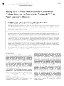 Salomons, T. V., Dunlop, K., Kennedy, S. H., Flint, A., Geraci, J., Giacobbe, P. and Downar, J. (2014) Resting state cortico-thalamic-striatal connectivity predicts pesponse to dorsomedial prefrontal rTMS in major depressive disorder. Neuropsychopharmacology, 39 (2). pp. 488-498. ISSN 0893-133X doi: 10.1038/npp.2013.222