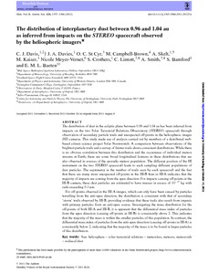 Davis, C. J. ORCID: https://orcid.org/0000-0001-6411-5649, Davies, J. A., St Cyr, O. C., Campbell-Brown, M., Skelt, A., Kaiser, M., Meyer-Vernet, N., Crothers, S., Lintott, C., Smith, A., Bamford, S. and Baeten, E. M. L. (2011) The distribution of interplanetary dust between 0.96 and 1.04 au as inferred from impacts on the STEREO spacecraft observed by the heliospheric imagers. Monthly Notices of the Royal Astronomical Society, 420 (2). pp. 1355-1366. ISSN 0035-8711 doi: 10.1111/j.1365-2966.2011.20125.x
