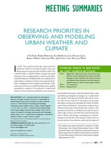 In 2007, the world reached the unprecedented milestone of half of its people living in cities, and that proportion is projected to be 60% in 2030. The combined effect of global climate change and rapid urban growth, accompanied by economic and industrial development, will likely make city residents more vulnerable to a number of urban environmental problems, including extreme weather and climate conditions, sea-level rise, poor public health and air quality, atmospheric transport of accidental or intentional releases of toxic material, and limited water resources. One fundamental aspect of predicting the future risks and defining mitigation strategies is to understand the weather and regional climate affected by cities. For this reason, dozens of researchers from many disciplines and nations attended the Urban Weather and Climate Workshop.1 Twenty-five students from Chinese universities and institutes also took part. The presentations by the workshop's participants span a wide range of topics, from the interaction between the urban climate and energy consumption in climate-change environments to the impact of urban areas on storms and local circulations, and from the impact of urbanization on the hydrological cycle to air quality and weather prediction.