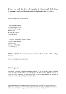 Purpose – Commercial real estate is a highly specific asset: heterogeneous, indivisible and with less information transparency than most other commonly held investment assets. These attributes encourage the use of intermediaries during asset acquisition and disposal. However, there are few attempts to explain the use of different brokerage models (with differing costs) in different markets. This study aims to address this gap. Design/methodology/approach – The study analyses 9,338 real estate transactions in London and New York City from 2001 to 2011. Data are provided by Real Capital Analytics and cover over $450 billion of investments in this period. Brokerage trends in the two cities are compared and probit regressions are used to test whether the decision to transact with broker representation varies with investor or asset characteristics. Findings – Results indicate greater use of brokerage in London, especially by purchasers. This persists when data are disaggregated by sector, time or investor type, pointing to the role of local market culture and institutions in shaping brokerage models and transaction costs. Within each city, the nature of the investors involved seems to be a more significant influence on broker use than the characteristics of the assets being traded. Originality/value – Brokerage costs are the single largest non-tax charge to an investor when trading commercial real estate, yet there is little research in this area. This study examines the role of brokers and provides empirical evidence on factors that influence the use and mode of brokerage in two major investment destinations.