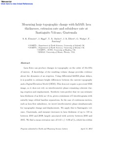 Lava flows can produce changes in topography on the order of 10s-100s of metres. A knowledge of the resulting volume change provides evidence about the dynamics of an eruption. We present a method to measure topographic changes from the differential InSAR phase delays caused by the height differences between the current topography and a Digital Elevation Model (DEM). This does not require a pre-event SAR image, so it does not rely on interferometric phase remaining coherent during eruption and emplacement. Synthetic tests predicts that we can estimate lava thickness of as little as �9 m, given a minimum of 5 interferograms with suitably large orbital baseine separations. In the case of continuous motion, such as lava flow subsidence, we invert interferometric phase simultaneously for topographic change and displacement. We demonstrate the method using data from Santiaguito volcano, Guatemala, and measure increases in lava thickness of up to 140 m between 2000 and 2009, largely associated with activity between 2000 and 2005. We find a mean extrusion rate of 0.43 +/- 0.06 m3/s, which lies within the error bounds of the longer term extrusion rate between 1922-2000. The thickest and youngest parts of the flow deposit were shown to be subsiding at an average rate of �-6 cm/yr. This is the first time that flow thickness and subsidence have been measured simultaneously. We expect this method to be suitable for measurment of landslides and other mass flow deposits as well as lava flows.