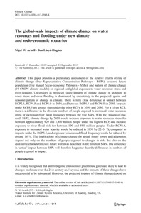 This paper presents a preliminary assessment of the relative effects of rate of climate change (four Representative Concentration Pathways - RCPs), assumed future population (five Shared Socio-economic Pathways - SSPs), and pattern of climate change (19 CMIP5 climate models) on regional and global exposure to water resources stress and river flooding. Uncertainty in projected future impacts of climate change on exposure to water stress and river flooding is dominated by uncertainty in the projected spatial and seasonal pattern of change in climate. There is little clear difference in impact between RCP2.6, RCP4.5 and RCP6.0 in 2050, and between RCP4.5 and RCP6.0 in 2080. Impacts under RCP8.5 are greater than under the other RCPs in 2050 and 2080. For a given RCP, there is a difference in the absolute numbers of people exposed to increased water resources stress or increased river flood frequency between the five SSPs. With the ‘middle-of-the-road’ SSP2, climate change by 2050 would increase exposure to water resources stress for between approximately 920 and 3400 million people under the highest RCP, and increase exposure to river flood risk for between 100 and 580 million people. Under RCP2.6, exposure to increased water scarcity would be reduced in 2050 by 22-24%, compared to impacts under the RCP8.5, and exposure to increased flood frequency would be reduced by around 16%. The implications of climate change for actual future losses and adaptation depend not only on the numbers of people exposed to changes in risk, but also on the qualitative characteristics of future worlds as described in the different SSPs. The difference in ‘actual’ impact between SSPs will therefore be greater than the differences in numbers of people exposed to impact.
