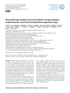 Simulated multi-model “diversity” in aerosol direct radiative forcing estimates is often perceived as a measure of aerosol uncertainty. However, current models used for aerosol radiative forcing calculations vary considerably in model components relevant for forcing calculations and the associated “host-model uncertainties” are generally convoluted with the actual aerosol uncertainty. In this AeroCom Prescribed intercomparison study we systematically isolate and quantify host model uncertainties on aerosol forcing experiments through prescription of identical aerosol radiative properties in twelve participating models. Even with prescribed aerosol radiative properties, simulated clear-sky and all-sky aerosol radiative forcings show significant diversity. For a purely scattering case with globally constant optical depth of 0.2, the global-mean all-sky top-of-atmosphere radiative forcing is −4.47Wm−2 and the inter-model standard deviation is 0.55Wm−2, corresponding to a relative standard deviation of 12 %. For a case with partially absorbing aerosol with an aerosol optical depth of 0.2 and single scattering albedo of 0.8, the forcing changes to 1.04Wm−2, and the standard deviation increases to 1.01W−2, corresponding to a significant relative standard deviation of 97 %. However, the top-of-atmosphere forcing variability owing to absorption (subtracting the scattering case from the case with scattering and absorption) is low, with absolute (relative) standard deviations of 0.45Wm−2 (8 %) clear-sky and 0.62Wm−2 (11 %) all-sky. Scaling the forcing standard deviation for a purely scattering case to match the sulfate radiative forcing in the Aero- Com Direct Effect experiment demonstrates that host model uncertainties could explain about 36% of the overall sulfate forcing diversity of 0.11Wm−2 in the AeroCom Direct Radiative Effect experiment.