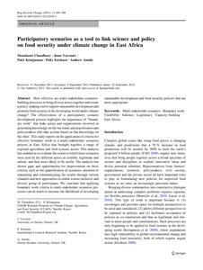 How effective are multi-stakeholder scenarios building processes to bring diverse actors together and create a policy-making tool to support sustainable development and promote food security in the developing world under climate change? The effectiveness of a participatory scenario development process highlights the importance of ‘boundary work’ that links actors and organizations involved in generating knowledge on the one hand, and practitioners and policymakers who take actions based on that knowledge on the other. This study reports on the application of criteria for effective boundary work to a multi-stakeholder scenarios process in East Africa that brought together a range of regional agriculture and food systems actors. This analysis has enabled us to evaluate the extent to which these scenarios were seen by the different actors as credible, legitimate and salient, and thus more likely to be useful. The analysis has shown gaps and opportunities for improvement on these criteria, such as the quantification of scenarios, attention to translating and communicating the results through various channels and new approaches to enable a more inclusive and diverse group of participants. We conclude that applying boundary work criteria to multi-stakeholder scenarios processes can do much to increase the likelihood of developing sustainable development and food security policies that are more appropriate.