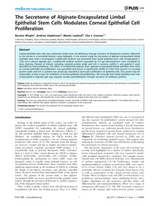 Wright, B., Hopkinson, A., Leyland, M. and Connon, C. J. (2013) The secretome of alginate-encapsulated limbal epithelial stem cells modulates corneal epithelial cell proliferation. PLoS ONE, 8 (7). e70860. ISSN 1932-6203 doi: 10.1371/journal.pone.0070860