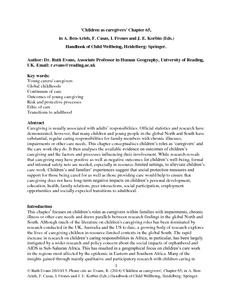 Caregiving is usually associated with adults’ responsibilities. Official statistics and research have demonstrated, however, that many children and young people in the global North and South have substantial, regular caring responsibilities for family members with chronic illnesses, impairments or other care needs. This chapter conceptualises children’s roles as ‘caregivers’ and the care work they do. It then analyses the available evidence on outcomes of children’s caregiving and the factors and processes influencing their involvement. While research reveals that caregiving may have positive as well as negative outcomes for children’s well-being, formal and informal safety nets are needed, especially in resource-limited settings, to alleviate children’s care work. Children’s and families’ experiences suggest that social protection measures and support for those being cared for as well as those providing care would help to ensure that caregiving does not have long-term negative impacts on children’s personal development, education, health, family relations, peer interactions, social participation, employment opportunities and socially expected transitions to adulthood.