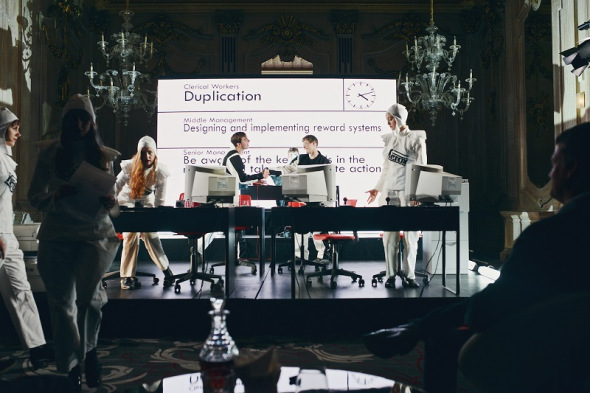 A Guide to Office Clerical Time Standards is an instructional performance piece based on a corporate manual from 1960. The pamphlet is focused on the time necessary for the accomplishment of minute labour procedures in the office, from the depressing and releasing of typewriter keys to the opening and closing of filing cabinet drawers. In the performance, seven costumed performers represent the different levels of management and employment while performing the actions described in the guide, accompanied by a live musical score. There has been much discussion of the changes to work in the west following the decline of post-Fordist service sector jobs. These increasingly emphasise the specificity of employees’ knowledge and cognitive skill. However, this greater flexibility and creativity at work has been accompanied by an opposite trajectory. The proletarisation of white collar work has given rise to more bureaucracy, target assessment and control for workers in previously looser creative professions, from academia to the arts. The midcentury office is the meeting point of these cultures, where the assembly line efficiency management of the factory meets the quantifying control of the knowledge economy. A Guide to Office Clerical Time Standards explores the survival of one regime into its successor following the lines of combined and uneven development that have turned the emancipatory promise of immaterial labour into the perma-temp hell of the cognitariat. The movement is accompanied by a score of guitar, bass and drums, the componenets of the rock ‘n’ roll music that rose from the car factories of the motor city and the cotton fields of the southern states to represent the same junction of expression and control.