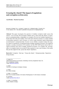This paper investigates the question of whether corruption might ‘grease the wheels’ of an economy. We investigate whether and to what extent the impact of regulations on entrepreneurship is dependent on corruption. We first test whether regulations robustly deter firm entry into markets. Our results show that the existence of a larger number of procedures required to start a business, as well as larger minimum capital requirements are detrimental to entrepreneurship. Second, we test whether corruption reduces the negative impact of regulations on entrepreneurship in highly regulated economies. Our empirical analysis, covering a maximum of 43 countries over the 2003–2005 period, shows that corruption facilitates firm entry in highly regulated economies. For example, the ‘greasing’ effect of corruption kicks in at around 50 days required to start a new business. Our results thus provide support for the ‘grease the wheels’ hypothesis.