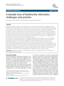 Biodiversity informatics plays a central enabling role in the research community's efforts to address scientific conservation and sustainability issues. Great strides have been made in the past decade establishing a framework for sharing data, where taxonomy and systematics has been perceived as the most prominent discipline involved. To some extent this is inevitable, given the use of species names as the pivot around which information is organised. To address the urgent questions around conservation, land-use, environmental change, sustainability, food security and ecosystem services that are facing Governments worldwide, we need to understand how the ecosystem works. So, we need a systems approach to understanding biodiversity that moves significantly beyond taxonomy and species observations. Such an approach needs to look at the whole system to address species interactions, both with their environment and with other species.It is clear that some barriers to progress are sociological, basically persuading people to use the technological solutions that are already available. This is best addressed by developing more effective systems that deliver immediate benefit to the user, hiding the majority of the technology behind simple user interfaces. An infrastructure should be a space in which activities take place and, as such, should be effectively invisible.This community consultation paper positions the role of biodiversity informatics, for the next decade, presenting the actions needed to link the various biodiversity infrastructures invisibly and to facilitate understanding that can support both business and policy-makers. The community considers the goal in biodiversity informatics to be full integration of the biodiversity research community, including citizens' science, through a commonly-shared, sustainable e-infrastructure across all sub-disciplines that reliably serves science and society alike.